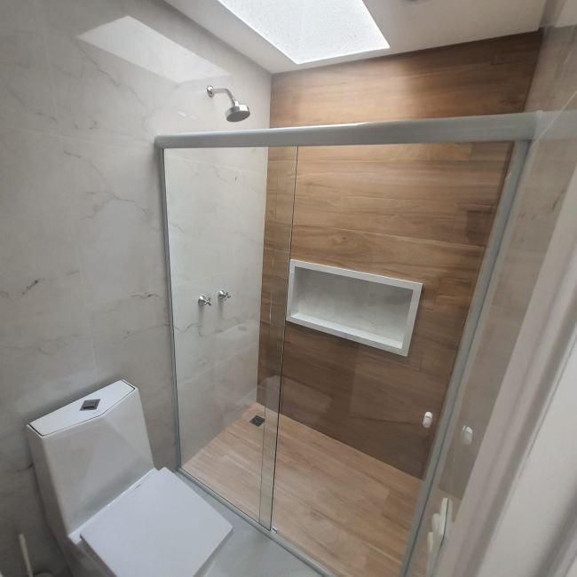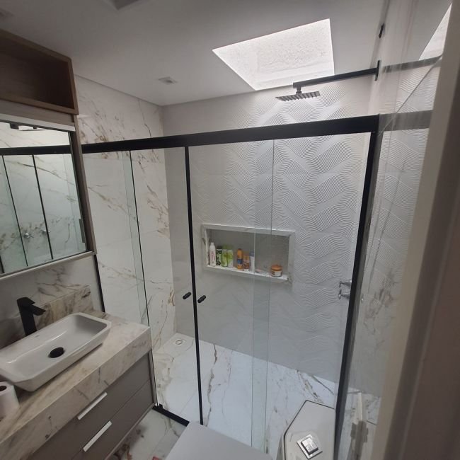 Estrutura em alumínio com vidro, desenvolvida para impedir a saída de água da área do banho com eficiência e elegância.